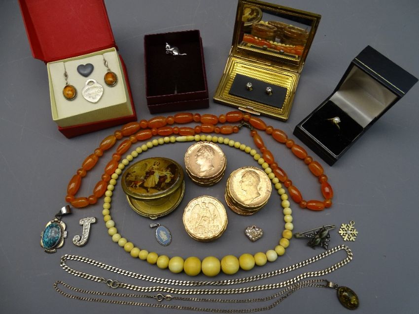 MIXED JEWELLERY, COINS & COLLECTABLES including a Cornelian type necklace and one other, sterling silver on white metal, brooches, earrings and necklaces, a Wedgwood Jasperware pendant, a quantity of Wellington Waterloo 1815 copy commemorative coins ETC