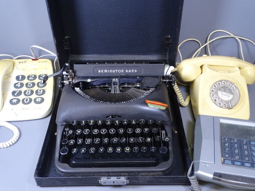 REMINGTON RAND VINTAGE TYPEWRITER IN A CASE and a quantity of old telephones