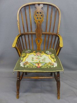 ANTIQUE ELM WINDSOR ELBOW CHAIR hoop and stickback with wheel splat on turned supports and stretcher