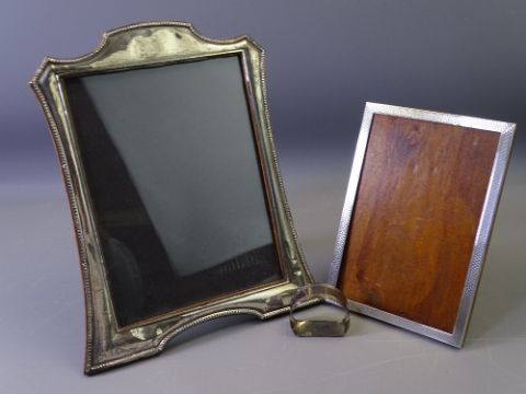 SILVER PICTURE FRAMES, the larger Birmingham 1924, 26 x 19cms and the other Birmingham 1929, 18 x 12cms and a hallmarked serviette ring
