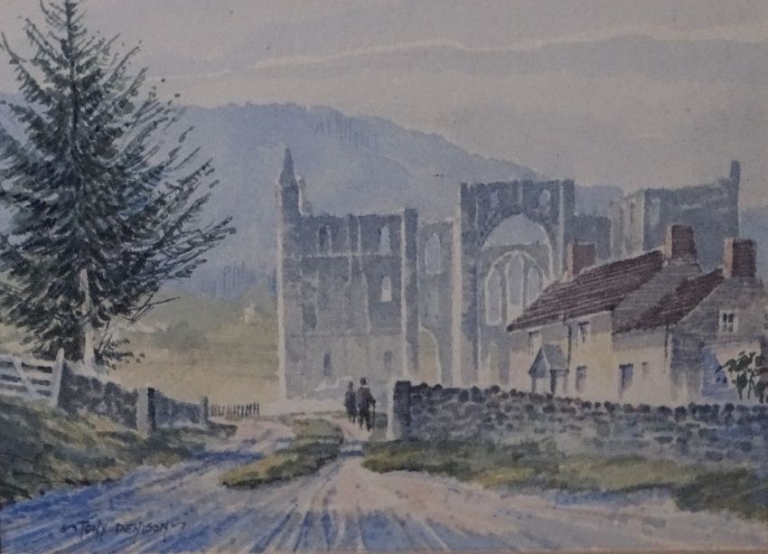 TONY DENISON (Yorkshire) watercolour - Abbey ruins with figures, 14 x 19cms