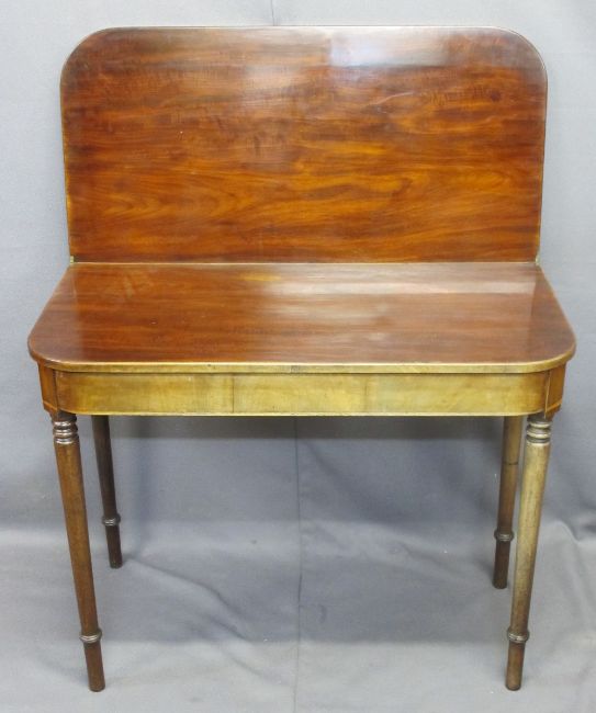 ANTIQUE MAHOGANY FOLDOVER TEA TABLE on turned tapering supports, 73cms H, 91cms W, 44.5cms D closed (some re-polishing/restoration required)
