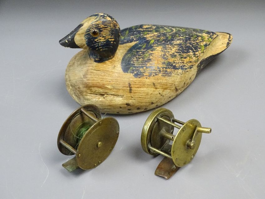 TWO VINTAGE BRASS FISHING REELS, rod in case, shooting stick and wood duck decoy