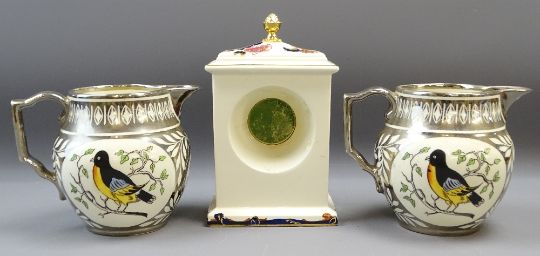 MASONS BLUE MANDALAY MANTEL CLOCK, 22cms H, with two Gray's pottery jugs