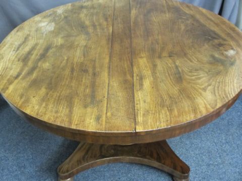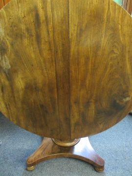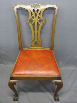 VICTORIAN BREAKFAST TABLE & SET OF FOUR SPLATBACK ANTIQUE DINING CHAIRS with rexine upholstered feet on ball and claw feet, 130cms D the table