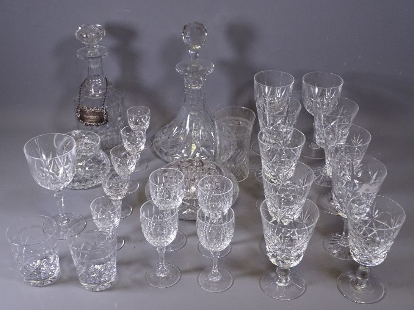 GLASSWARE - two decanters, one with silver whisky label and quality drinkware