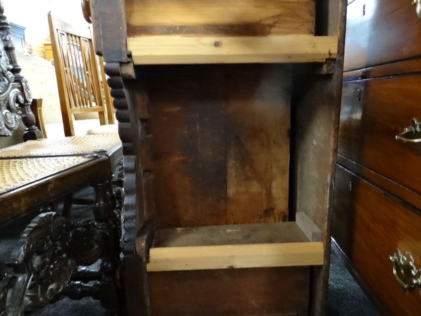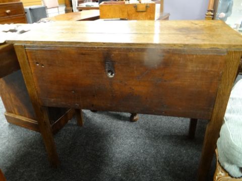 19TH CENTURY OAK LOW BOY AND WALNUT DRESSING STOOL, table with boarded top above arrangement of three drawers fan carved under arch, 95 x 44 x 78cms (2)There is general wear to the top, light scratches and stains.All drawers slide well.There has been some restoration work done to one of the smaller drawers and to the underneath of the table (see photographs)All handles are a little loose, they all turn and one of the top boards is starting to lift.There is a hole in the back, looks like it was made for a cable.The legs have a few chips but the whole piece feels nice and solid.I could not find any worm.Regarding the stool, the upholstery looks good, no rips or tears just a little dirty.One leg on the stool feels a little loose.