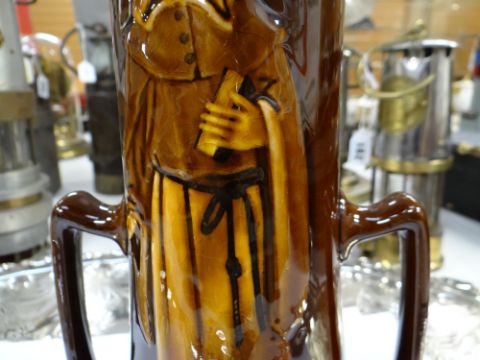 ROYAL DOULTON 'KINGSWARE' VASE BY CHARLES NOKE, decorated with a barefooted monk holding a tome, village landscape in the distance, 33cms high