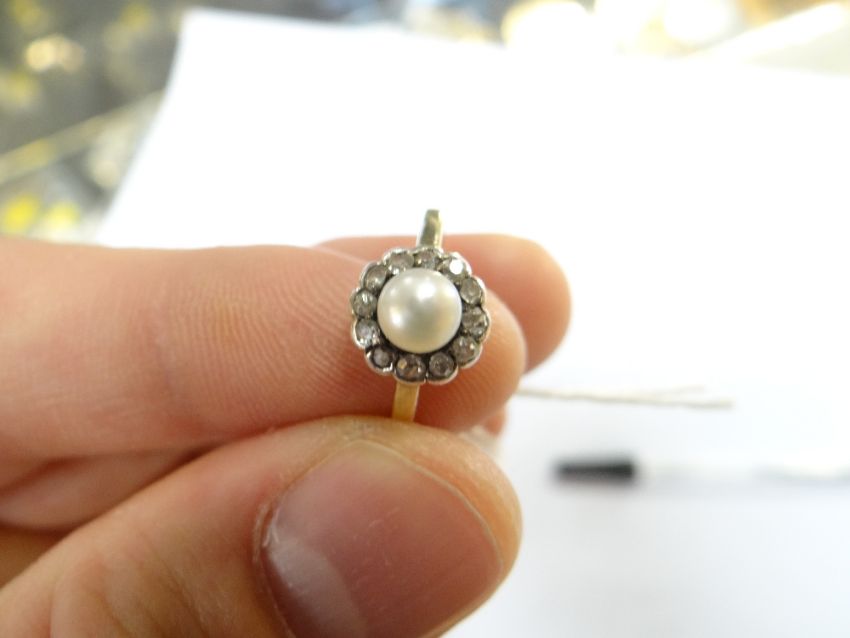 18CT GOLD PEARL & DIAMOND CLUSTER RING, the central pearl surrounded by twelve diamonds, ring size Q / R, 2.5gmsThe diamonds are chips and so too small to grade.The pearl is size 5 or 5mm in diameter. It has a flat bottom, it has been cut to fit into the setting.A few of the diamond chips look very dull, no colour.