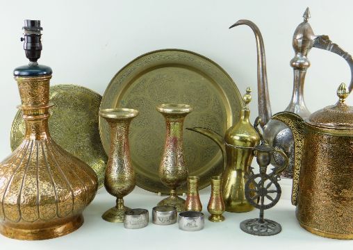 ASSORTED MIDDLE EASTERN METALWARE including copper huqqa base converted to electric lamp, similar coffee pot ETC
