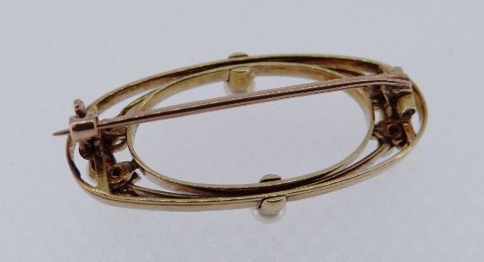 SEED PEARL & DIAMOND BAR BROOCH in yellow metal setting of oval design, in Crouch of Swansea box, 4.7gms