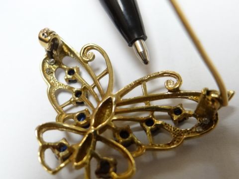 9CT GOLD BAR BROOCH of butterfly design set with eight sapphires and diamond chips, 4.8gmsBehind the antenna, it is stamped 375