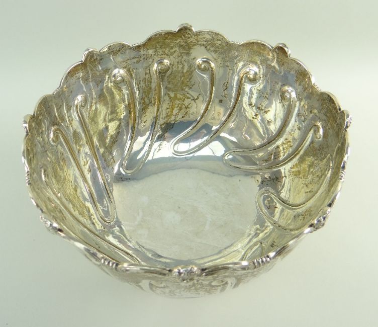 GEORGE V SILVER ROSE BOWL BY D & J WELLBY, LONDON, mask and c-scrolled rim on fluted bowl with gadrooned foot, 24.6 t.oz, 15cms high