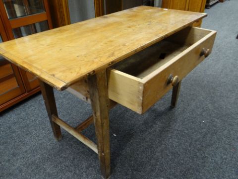 FRENCH FRUITWOOD & OAK FARMHOUSE TABLE, boarded top with cleated ends, frieze drawer, tapering square legs tied by H-stretcher, 126 x 57cms