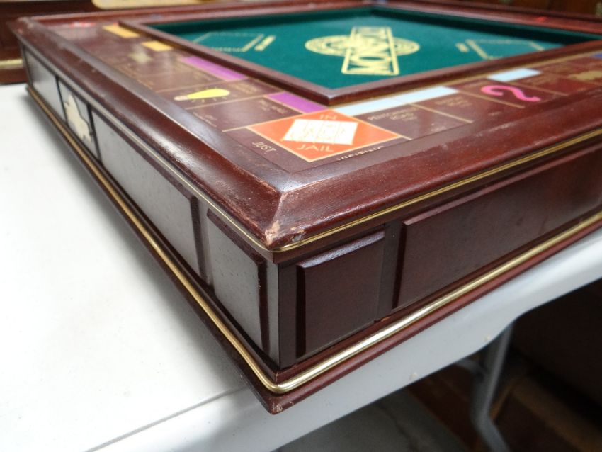 FRANKLIN MINT COLLECTOR'S EDITION MONOPOLY GAME in stained mahogany with pull out drawers and bound leafletYes the glass cover is present. There is a scratch on the glass.There is some general wear, light surface scratches especially to the corners.Instructions are includedSome of the gold glitter has come off the centre pattern in the middle of the board, where you would roll the dice.The drawer slides well