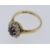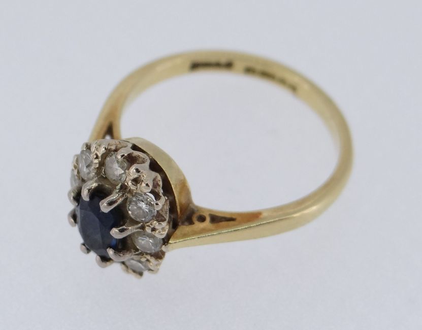 18CT GOLD SAPPHIRE & DIAMOND CLUSTER RING, the central sapphire (0.6 x 0.4cms) surrounded by eight diamonds, diamond weight 0.3cts overall approximately, size L / M, 4gms