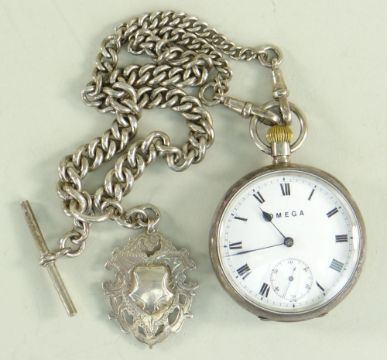 OMEGA SILVER OPEN FACED POCKET WATCH the case, enamel dial and movement marked 'Omega', together with graduated silver pocket watch chain, 'T' bar and silver pendant, 172.1gms