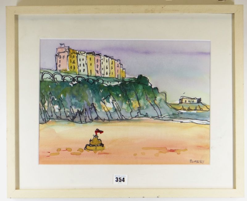 SUE POMERY-WILKS pen and wash - entitled verso 'South Beach, Tenby', signed, 28 x 37.5cms