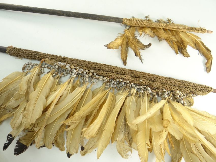 TWO ASMAT SPEARS, Irian Jaya, Indonesian New Guinea, with feather and seed embellishments, 224cms long (2)