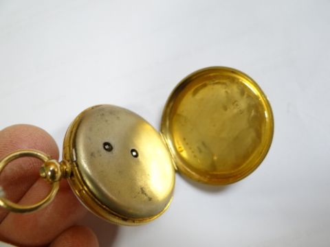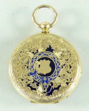 18CT GOLD & ENAMEL LADIES FOB WATCH having Roman numeral chapter ring, 33.5gmsIt does not seem to be working.It has a lot of dents and dings.There is a lot of enamel missing from the back.The case dimeter is 35mm
