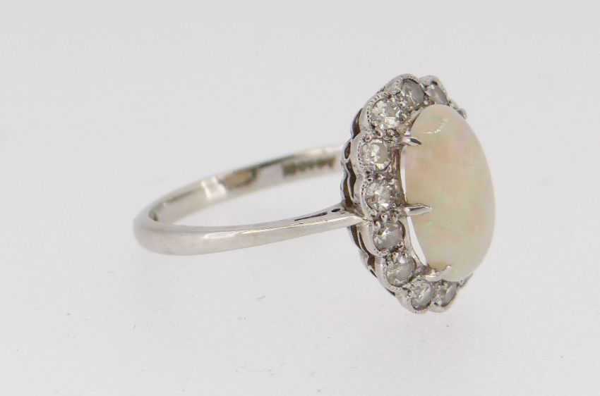 18CT WHITE GOLD OPAL & DIAMOND CLUSTER RING, the central opal (1.1 x 0.6cms) surrounded by fourteen diamonds, size M, 2.8gms, (boxed)