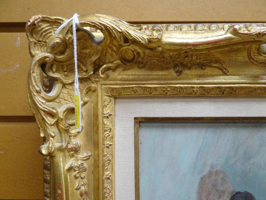 FOLLOWER OF MARIE LAURENCIN (1885 - 1956), oil on board - Leda and the Swan with mermaids, bears signature, in gilt gesso frame, 34 x 24cm