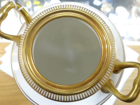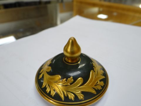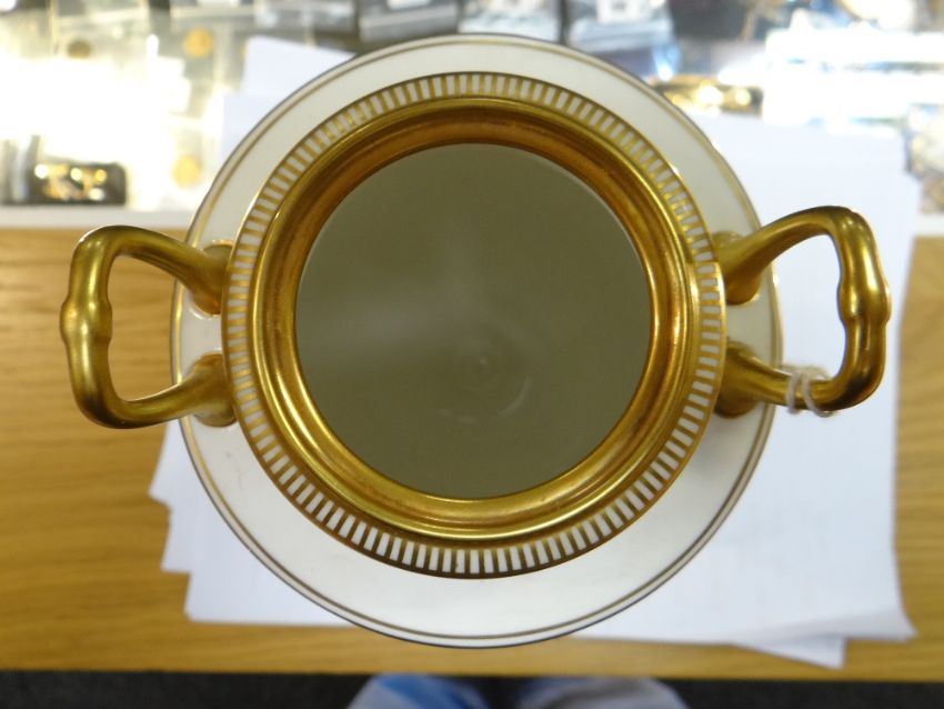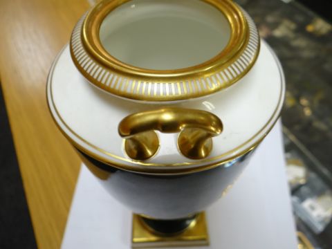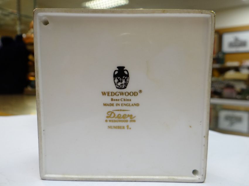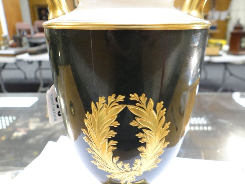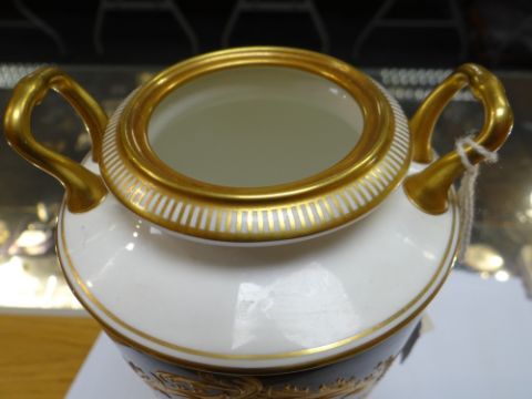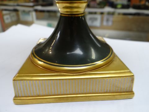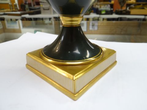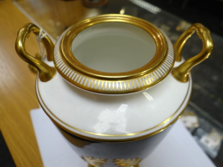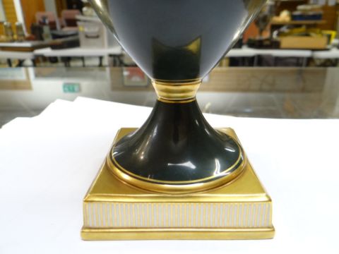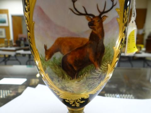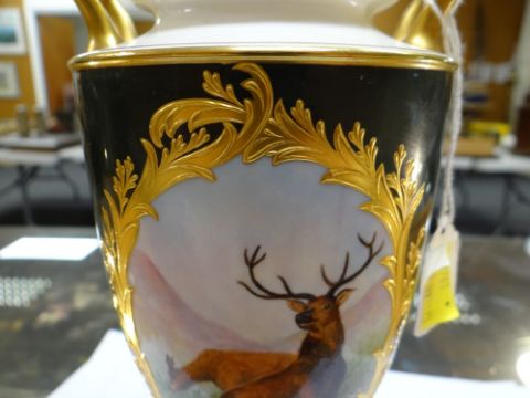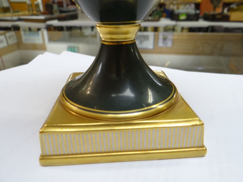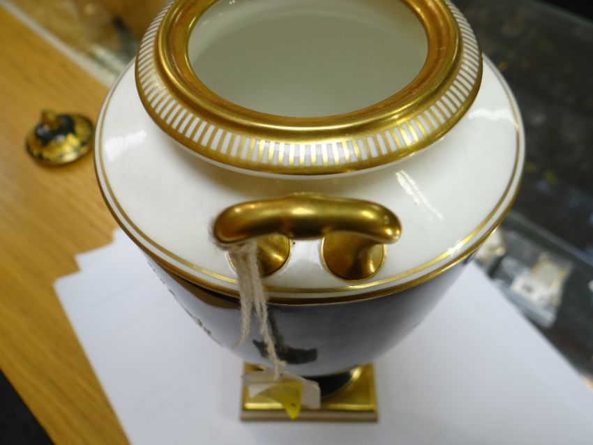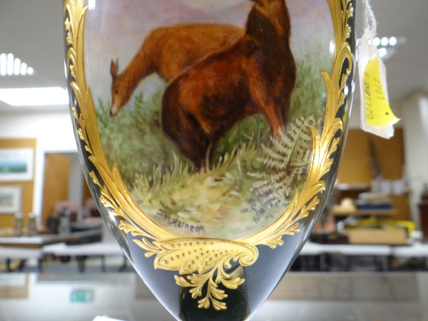 PROBABLY UNIQUE WEDGWOOD BONE CHINA VASE & COVER painted with vignette after Landseer's 'Monarch of the Glen' signed M. Harnett, entitled in script under the base 'Deer', 'No.1', printed marks and date 1990, 25cms high Auctioneers Note: The shape is known from Wedgwood's 1997 Genius Collection, in particular the Chatsworth House Vase also painted by M. Harnett, which was issued in an edition of 150. This pattern however is unrecorded in the Wedgwood archives, and therefore likely a unique special commission.There is gilt loss to the top of the finial.Regarding the lid, there is a small scratch which is only visible when viewed under light.There is very light gilt wear to the handles.