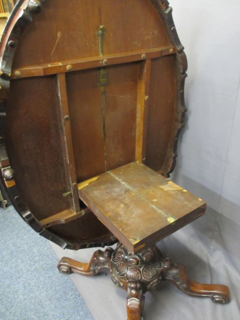 ROSEWOOD TILT-TOP BREAKFAST TABLE on central pedestal, 74cms H, 154cms W, 106cms D and six Rosewood balloon back dining chairs