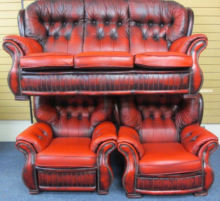 VINTAGE BUTTON BACK RED LEATHER EFFECT THREE PIECE SUITE of three seater settee and a pair of armchairs (one a recliner), all having shaped fold-over arms, 102cms H, 193cms W, 94cms D and the chairs 102cms H, 99cms W, 94cms D