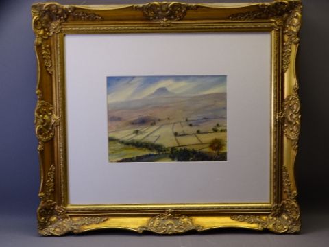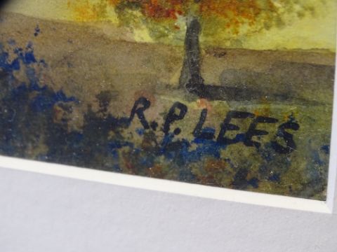 R P LEES watercolour - titled 'Shutlings Loe, Peak District' verso, 25 x 35cms, signed lower right in an oversize mount and a modern fancy gilt frame, 67 x 77cms overall
