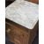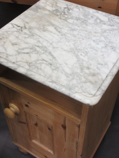 ANTIQUE STYLE MARBLE TOP WASH STAND & TWO BEDSIDE CABINETS, the wash stand with upper shelf and under-tier pot board with shaped front, 107cms overall H, 124.5cms W, 43cms D, the bedside cabinets with 40 x 40cms marble tops over an open storage shelf, single panel door with turned wooden knob and interior shelf on turned bun feet, 74cms H (breaks and repairs to the sides of the marble splashback, upper shelf requires reattaching)