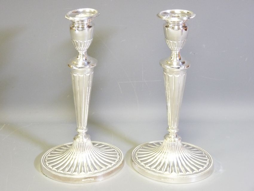 CLASSICAL STYLE SILVER CANDLESTICKS, A PAIR, Sheffield 1968, Maker John Turton & Co, 28.5cms H having weighted oval bead edge and fan pattern bases, tapered fluted columns and urn shape candle holders with matched bead pattern removable sconces, Birmingham hallmarked 1903