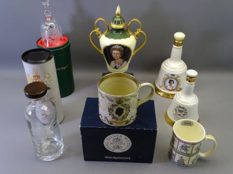 MIXED POTTERY, PORCELAIN & GLASSWARE COMMEMORATIVES to include a Wedgwood 25th Anniversary tankard designed by Richard Guyatt, a Thomas Webb crystal bell for Christmas 1978, boxed, two empty Wade Whisky bells ETC