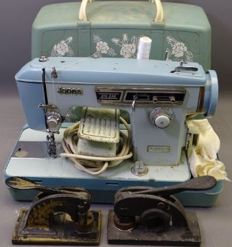 JONES ZIG ZAG ELECTRIC SEWING MACHINE IN CASE WITH FOOT PEDAL and two vintage cast iron desk stamps E/T