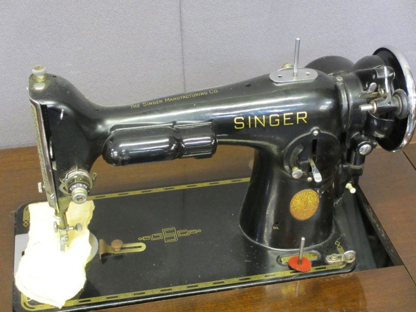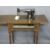 SEWING TABLE WITH SINGER CONTENTS and compartmented drop front, 79cms H, 35cms W, 45cms D (closed)