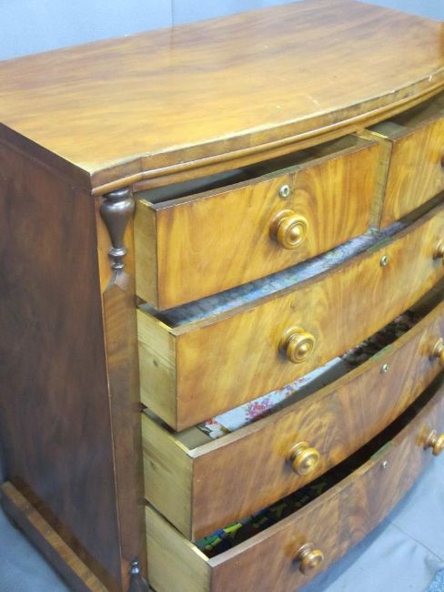 VICTORIAN MAHOGANY BOW FRONTED CHEST of two short over three long drawers, 111cms H, 106cms W, 58cms D