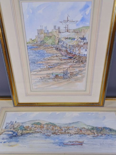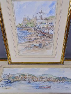 KEVIN SPARROW two watercolours - 1. Conwy with Castle and Bridge from the other side, signed, 34 x 22cms and 2. Conwy Quay with boats and Castle in the background, 18 x 48cms
