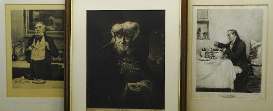 18TH CENTURY MEZZOTINT and later prints of gentlemen (3) to include J BOYDELL after Rembrandt - depicting an Eastern nobleman in turban, sculptor William Pether 1778, 47 x 34cms and W DENDY SADLER - depicting a gentleman speaker at a dining table, copyrighted 1908 by Raphael Tuck & Sons Ltd, 41 x 29.5cms and another depicting a gentleman seated at a table and preparing food, London published 1913 by L H Lefevere, signed in pencil by the artist and possibly the engraver, 40 x 31cms