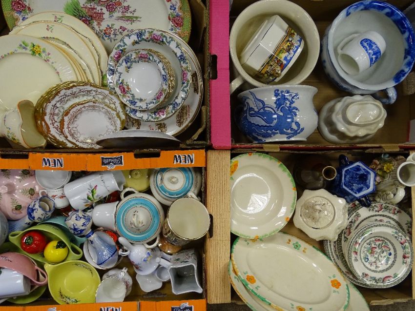 VICTORIAN BLUE & WHITE & OTHER CHAMBER POTS, decorative tea and dinnerware, mid-century soup bowls and other decorative items (within 4 boxes)