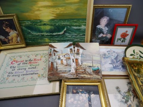 J MARTIN oil on board - titled verso 'The Rolling Tide', signed and dated '73, 48.5 x 74cms, a framed needlework panel 'Christ is the Head of this House, the Unseen Guest, the Silent Listener', 38.5 x 47cms, ROLO box mounted oils on canvas, a pair - Continental street and a shoreline house with boat, 41 x 24cms, with a further quantity of framed pictures and prints and two decorative trays