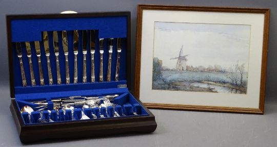 H HUGHES-WILLIAMS print - Melin Llynon (Anglesey Wind Mill), 36 x 35cms and a part canteen of Angora plated cutlery
