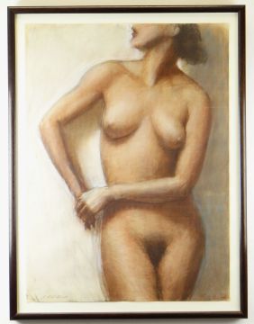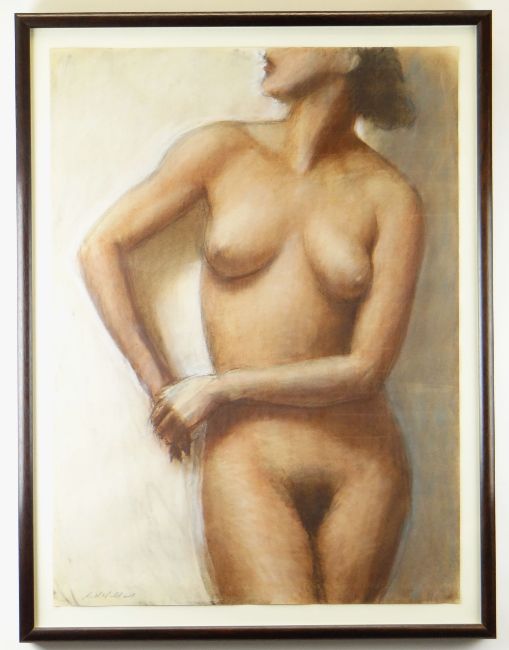 HARRY HOLLAND pastel - standing female, entitled verso on Martin Tinney Gallery label 'Nude' and dated 1993, signed, 75 x 55cms