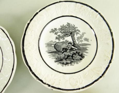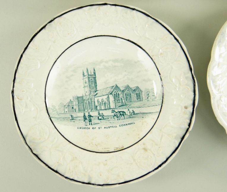 FOUR SWANSEA DILLWYN CHILD'S PLATES each having moulded tulip and rose borders, with transfer interiors comprising (1) titled portrait of 'Rev. John Fletcher', (2) 'The Ages of Man Second Childishness' (rare), (3) 'Church of St Austell Cornwall' and (4) a 'Rural Scenes' with title printed on base, three with impressed Dillwyn mark, one with Evans & Glasson triangular mark (1850-1862), 15.5cms diam