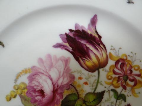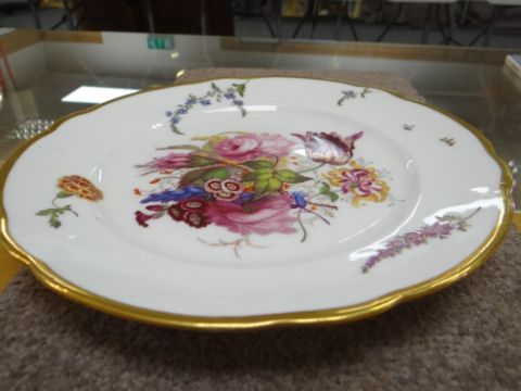 A NANTGARW PORCELAIN PLATE WITH LARGE SPRAY OF FLOWERS of lobed circular form and with gilded rim, flowers include a pink rose, pansies, and forget-me-knots, two insects to border, impressed NANT GARW CW to base, 24cms diam