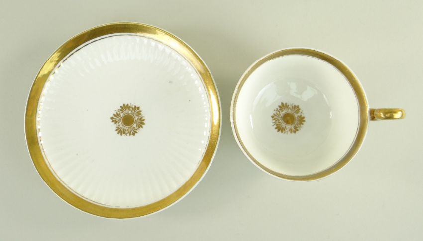 A SWANSEA PORCELAIN PARIS FLUTE BREAD PLATE & BREAKFAST CUP & SAUCER the plate of circular form, 24cms diam, cup with high curved-back loop handle, each with gilded motif and solid gilt bands, saucer with stencilled SWANSEA mark to base