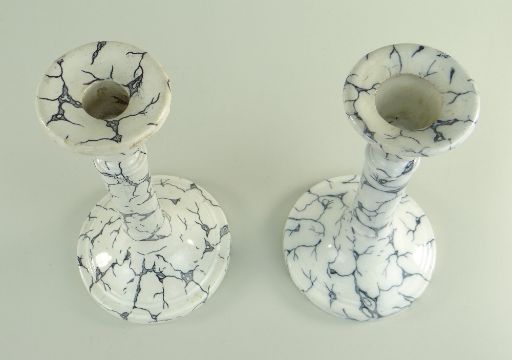 PAIR OF RARE SWANSEA CAMBRIAN POTTERY CANDLESTICKS & PLATE circular based of columnar form, in the 'Lazuli' transfer with pattern back-stamp to one, 22.5cms high, together with Lazuli plate, 26cms diam.