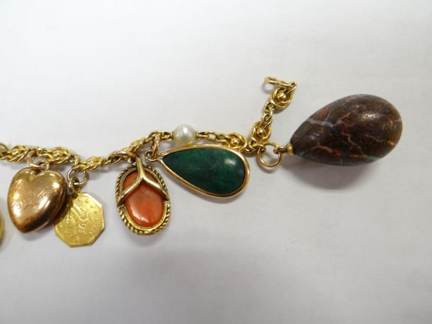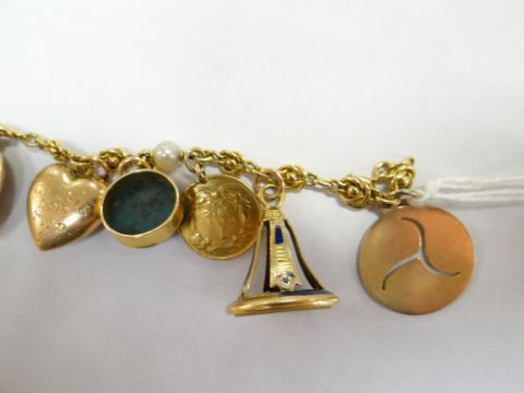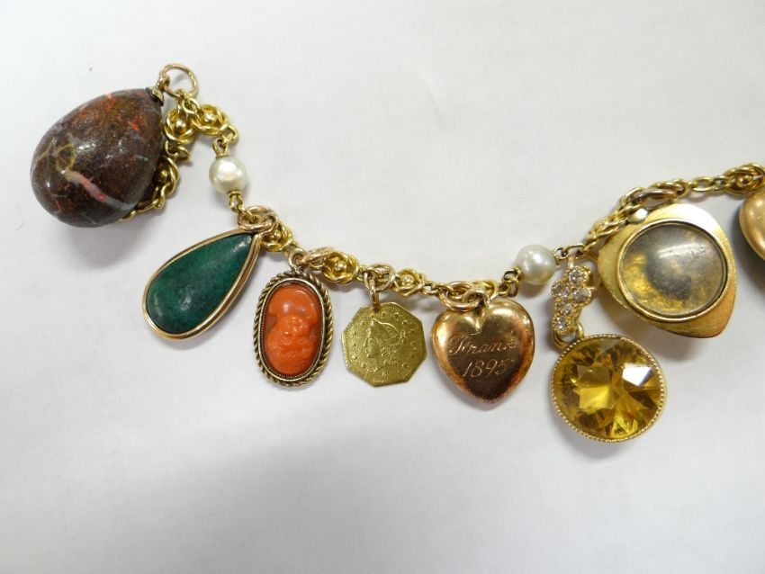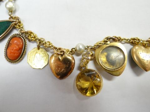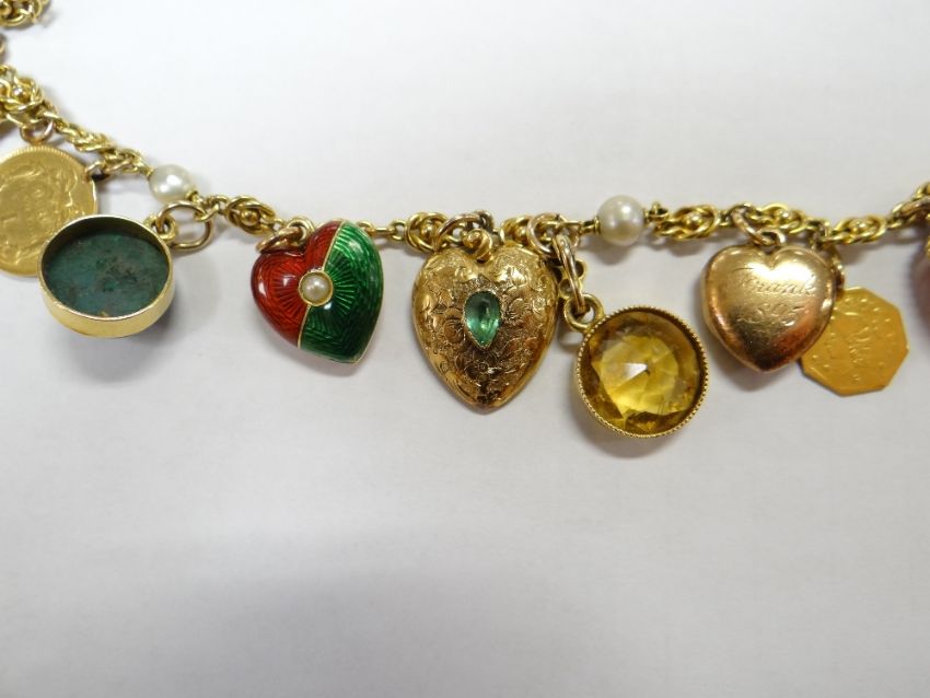 VICTORIAN GOLD CHARM BRACELET having double loop and ball links with seed pearls, holding twelve quality charms to include an 1856 gold one dollar, a golden citrine and diamond drop,1895 dated enamel and seed pearl heart, an 1895 dated enamel heart locket with diamond inset, an intaglio and enamelled seal and other semi-precious stone set charms, no visible hallmarks, 36.4gms overall