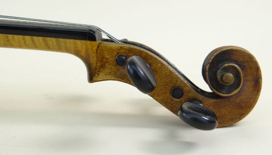Condition Report: extensively restored, table with several restored cracks, left top ribs repaired, scroll replaced, scroll holed redrilled, top edge of scroll chip restored, loose internal pillar, dints etc, name scratched into the vanish in several places, varnish worn in places. Rosewood case velvet interior largely intact with original plated fittings (plating worn). Bow in excellent condition