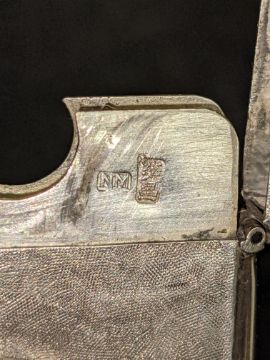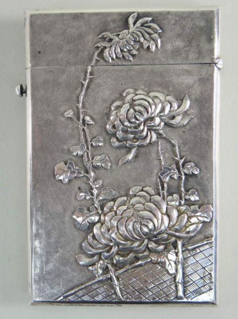 CHINESE SILVER CARD CASE, c. 1900, retail mark 'WN' for Wing Nam and two character mark possibly reading Zhao Chang, embossed in high relief with a four-clawed dragon in clouds around monogrammed cartouche 'AMB', reversed with flowering chrysanthemum, 3.5t.oz, 11 x 7.5cms