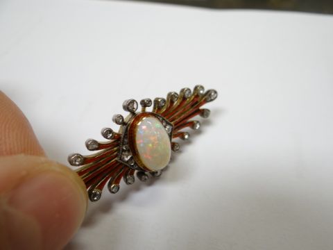 Condition Report: some losses to the enamel surrounding the opal and at the start of the enamel arms. Opal appears in good overall condition with no serious damage just surface wear and minor scratches. No diamonds missing, clasp in working order